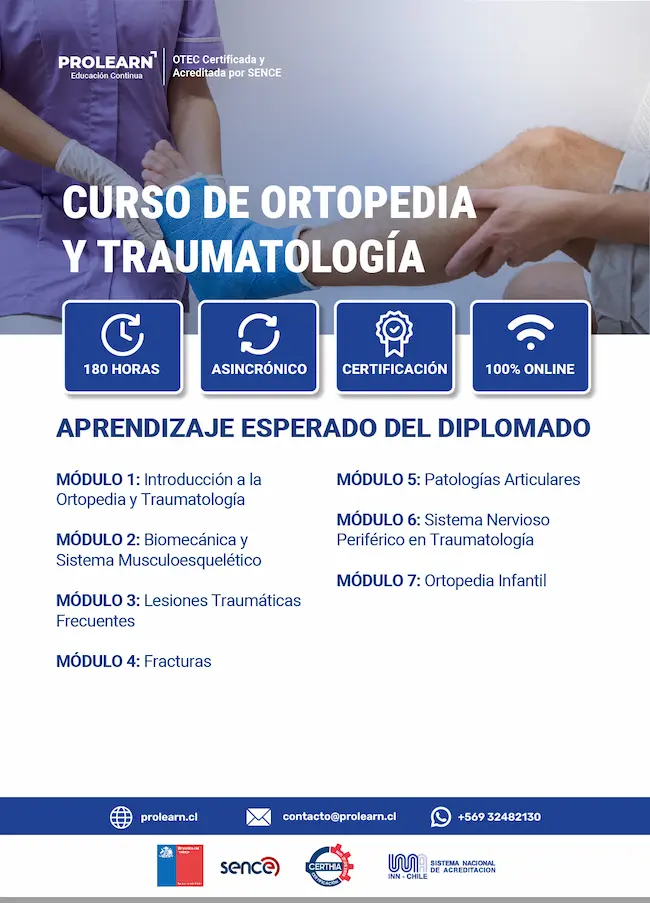 Descripción: El curso entrega formación actualizada en el abordaje integral de patologías musculoesqueléticas, incluyendo diagnóstico, tratamiento y manejo de lesiones traumáticas y enfermedades ortopédicas. Aborda principios clínicos, cuidados, rehabilitación y apoyo en procedimientos, fortaleciendo las competencias técnicas para el desempeño en distintos niveles de atención en salud. Cuenta con certificación emitida por una OTEC reconocida por SENCE y es considerado para puntaje en carrera funcionaria según bases vigentes, aportando al desarrollo profesional en el área clínica.