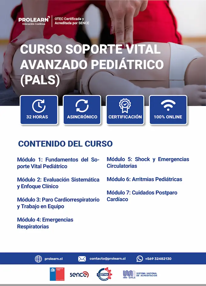 Descripción: Este curso PALS proporcionará los conocimientos esenciales para abordar emergencias pediátricas, incluyendo el reconocimiento de arritmias, la aplicación de algoritmos PALS y el manejo avanzado de vías aéreas. Modalidad 100% online y asincrónica, te permitirá avanzar a tu propio ritmo, adaptándose a tu disponibilidad. Al finalizar, recibirás una certificación oficial, reconocida por SENCE.