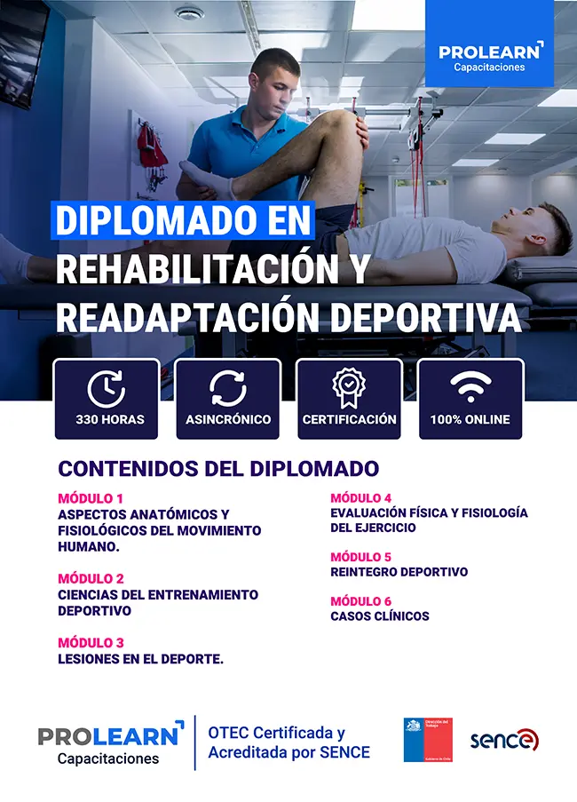 Descripción: El Diplomado en Rehabilitación y Readaptación Deportiva entrega una formación práctica en prevención, evaluación, tratamiento y reintegro de lesiones deportivas. En seis módulos se abordan contenidos de anatomía, fisiología, entrenamiento, evaluación funcional y readaptación, con enfoque aplicado y actualizado. Está dirigido a kinesiólogos, fisioterapeutas, entrenadores, preparadores físicos, licenciados en educación física y estudiantes avanzados de salud y deporte que deseen especializarse en rehabilitación deportiva, mejorar el rendimiento, prevenir lesiones y facilitar el retorno seguro a la práctica deportiva.
