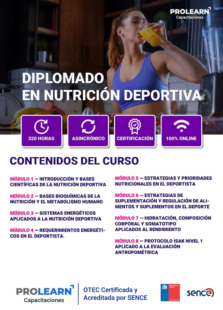 Descripción: Dirigido a profesionales y estudiantes del área de la salud, así como a cualquier persona interesada en la nutrición aplicada al ejercicio y al deporte. Este Diplomado en Nutrición Deportiva 100% online te permite estudiar a tu ritmo y obtener certificación automática, válida para CONISS, empleos públicos y cualquier centro de salud en Chile, además de estar reconocida por SENCE. Aprenderás sobre nutrición, hidratación, suplementación y evaluación corporal para optimizar el rendimiento y la salud de personas activas y deportistas.